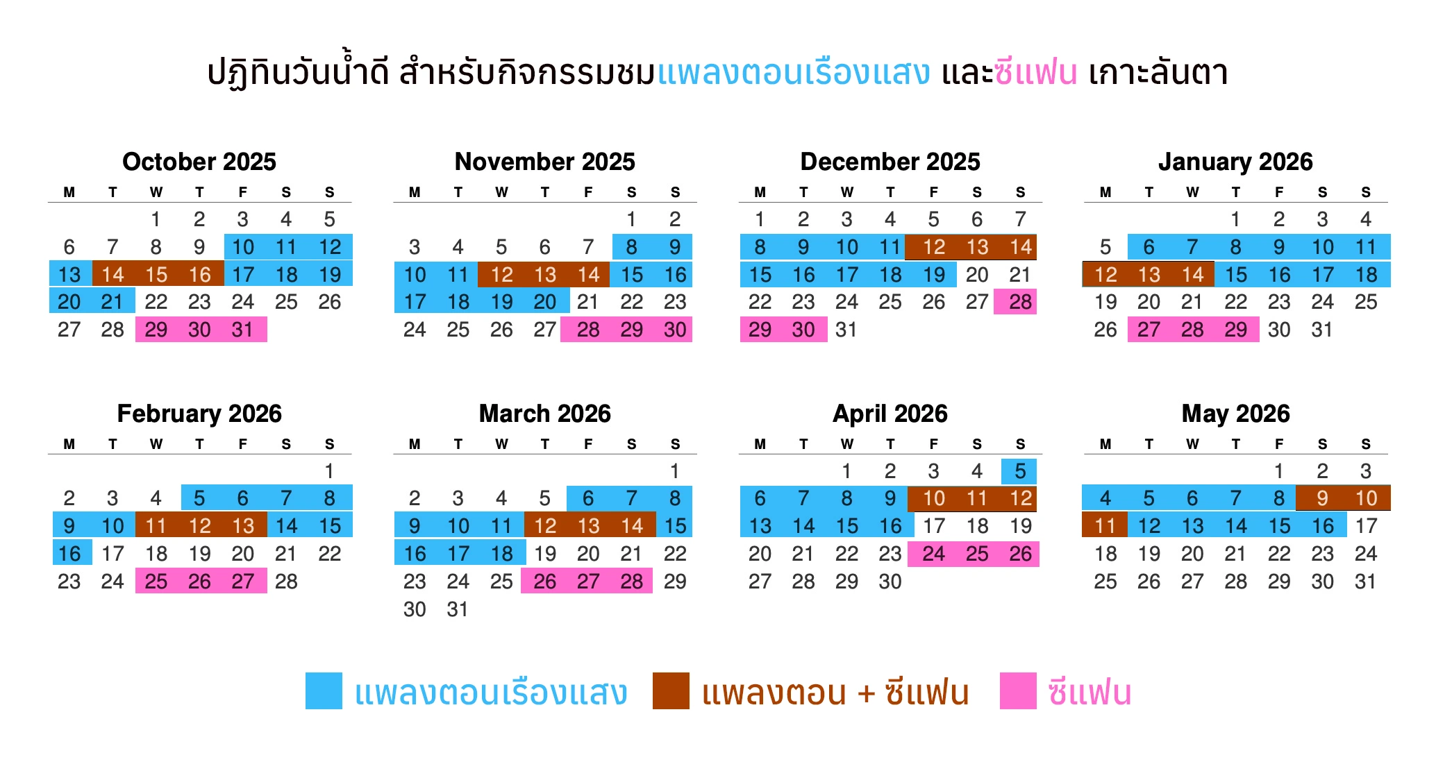 เนื่องจากพื้นที่ซีแฟนการ์เดน เป็นจุดที่มีกระแสน้ำ มีน้ำไหลตลอดเวลา ดังนั้นการมาเที่ยวจุดนี้จึงมีข้อจำกัดเรื่องสภาพน้ำ และช่วงที่น้ำเหมาะสมที่จุดจะเป็นช่วงน้ำตาย (น้ำลงรอบเดียว) เพราะกระแสน้ำจะน้อยกว่าวันปกติ และน้ำจะมีโอกาสใสกว่า ดังนั้นเพื่อให้การเดินทางมาท่องเที่ยวมีความปลอดภัย และมีโอกาสได้เห็นทัศนียภาพใต้น้ำได้อย่างสวยงาม เราแนะนำให้มาตามปฏิทินที่มาร์คสีไว้ด้านล่างนี้ครับ **สีชมพู และสีส้ม คือน้ำตาย***